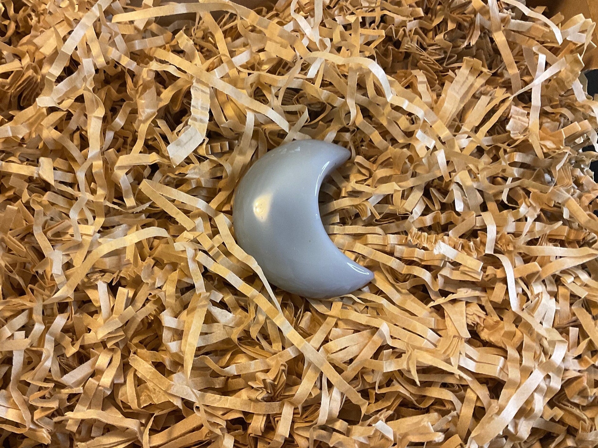 Agate crystal polished and shaped into a crescent moon.